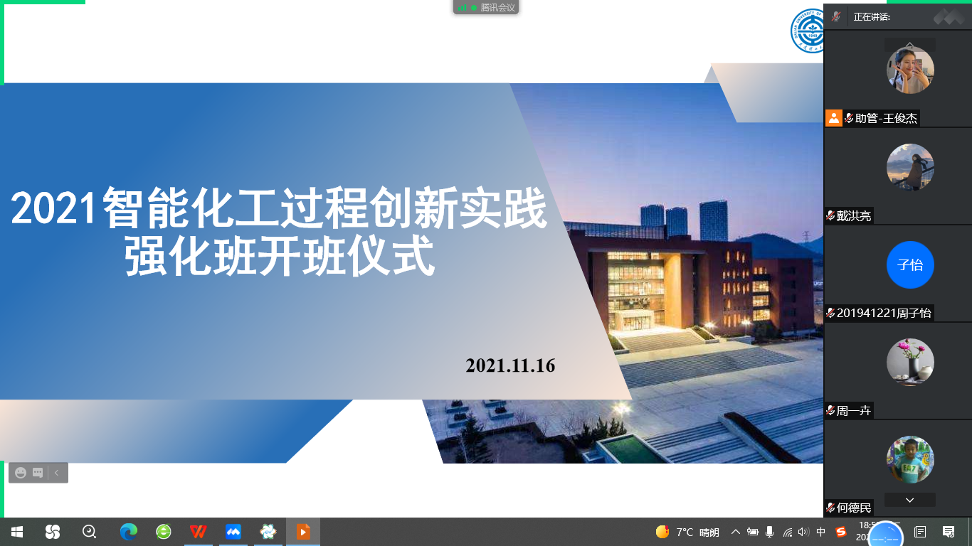 2021年11月16日,2021级化工智能过程创新实践强化班在腾讯会议平台举行了开班仪式暨师生见面会,best365体育官方网站副院长叶俊伟教授、负责人潘艳秋教授、团队教师董宏光教授、周一卉副教授、鲁金明副教授、关珺副教授、肖武副教授、何德民工程师以及2021级化工智能过程创新实践强化班的全体同学参加了开班仪式,仪式由潘艳秋教授主持。