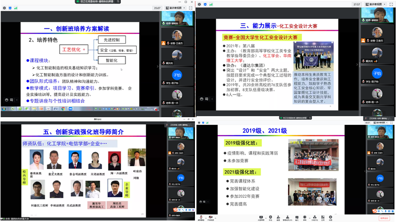 会议伊始,负责人潘艳秋教授介绍了创新实践强化班建设的背景,对创新班培养方案及课程设置、能力展示途径、导师团队等进行了解读,结合2019级化工智能过程创新班的具体实践情况对2021级化工智能过程创新班提出了更高的期望,并热情欢迎新同学的到来,希望借助化工智能过程创新班这一平台培养出初步掌握化工“过程-安全-控制”三位一体多学科知识和智能制造的拔尖创新复合型人才。